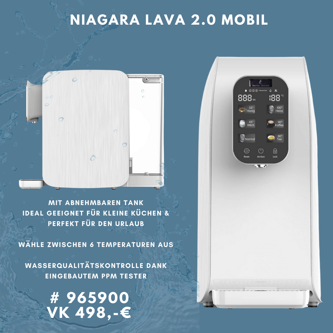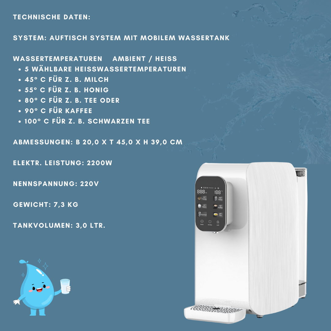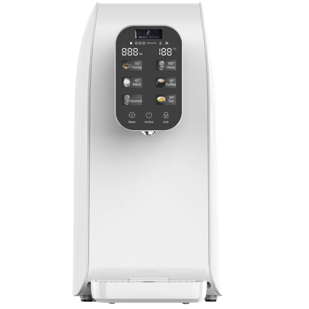 Neben dem raumtemperiertem Wasser besitzt die Wasseraufbereitungsanlage 6 unterschiedliche Wassertemperaturen. Außerdem ist diese ohne festen Anschluss am Wassersystem mobil. Perfekt um das eigene Wassergerät in die Ferienwohnung mitzunehmen. Das schlanke und platzsparende Design ist ideal für kleinere Küchenzeilen.